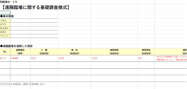 たとえば、国土交通省の関東地方整備局では、上の画像である「遠隔臨場に関する基礎調査様式」のExcelデータを無料で配布しています。条件に合う工事の場合、そのまま適用できるため、報告や記録の品質を一定に保ちやすくなります。