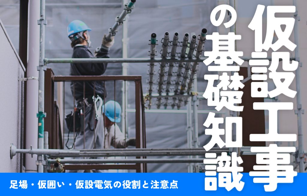 仮設工事施工管理アプリ現場管理アプリ 仮設工事の基礎知識|足場・仮囲い・仮設電気の役割と注意点 2026年2月10日 この記事をシェアする 建設現場では、本工事に入る前から、さまざまな準備作業が行われています。その中でも、工事の安全性や作業効率、周囲への配慮を支える重要な工程が仮設工事です。 仮設工事とは、足場や仮囲い、仮設電気・仮設トイレなど、本工事を円滑かつ安全に進めるために一時的に設置される設備や構造物を指します。これらは完成後に残るものではありませんが、設置や管理を誤ると、労働災害や近隣トラブル、工程遅延の原因となるため、施工管理において軽視できない分野です。 特に新人施工管理や現場担当者にとっては、「仮設工事とは何を指すのか」「本工事とどう違うのか」「どのタイミングで設置・撤去するのか」といった基本を体系的に理解しておくことが、現場対応力の土台になります。 本記事では、仮設工事の定義や本工事との違いを整理したうえで、足場・仮囲い・仮設道路・仮設電気・仮設トイレなどの主な種類、施工から撤去までの流れ、安全管理や法令面での注意点をわかりやすく解説します。 仮設工事の全体像を押さえ、現場での判断や管理に自信を持つための基礎知識として、ぜひ参考にしてください。 仮設工事とは?本工事との違いと役割 仮設工事の定義と目的 仮設工事とは、建設工事を安全かつ円滑に進めるために、一時的に設置される設備や構造物に関する工事を指します。足場、仮囲い、仮設電気、仮設トイレなどが代表例で、工事完了後には撤去される点が特徴です。 本工事のように完成後に形として残るものではありませんが、現場の安全性や作業効率を左右する重要な役割を担っています。 仮設工事の目的は、主に次の三つに整理できます。 作業員の安全確保 足場や仮設電気の適切な設置・管理により、労働災害を防止する 作業効率の向上 仮設道路や仮設事務所を整備し、本工事を滞りなく進める 第三者災害・近隣トラブルの防止 仮囲い設置や動線管理によって、現場外への影響を最小限に抑える 出典:国土交通省 土木工事安全施工技術指針 本工事との違い|なぜ区別して管理するのか 仮設工事と本工事は、目的や管理視点が大きく異なります。施工管理者は、この違いを理解したうえで、それぞれを適切に管理する必要があります。 項目 仮設工事 本工事 目的 本工事を安全・円滑に進める 建物・構造物を完成させる 設置期間 一時的(撤去前提) 完成後も残る 工程 初期集中・変更が発生しやすい 中長期で固定的 管理視点 点検・是正・撤去 品質・出来形 参考:国土交通省 公共建築数量積算基準 仮設工事を軽視した場合、現場にはさまざまな影響が及びます。足場の不備による事故、動線計画の甘さによる工程遅延、仮囲い不足による近隣トラブルなど、問題は本工事だけでなく現場全体に波及します。逆に、仮設工事が適切に計画・管理されていれば、現場は安定し、本工事の品質向上にもつながります。 施工管理者は、仮設工事を「最初だけの作業」と考えず、使用期間中の点検や是正まで含めて管理する意識を持つことが重要です。 出典:厚生労働省 労働安全衛生法 仮設工事の主な種類と内容 仮設工事には、建設現場を安全かつ円滑に運営するためのさまざまな設備が含まれます。これらは工事内容や現場条件によって組み合わせが異なりますが、施工管理者はそれぞれの役割と管理ポイントを理解しておく必要があります。 主な仮設設備と役割 仮設工事で用いられる代表的な設備と、その役割・管理上の注意点は次のとおりです。 仮設設備 主な役割 管理上の注意点 足場 高所作業の安全確保・作業性向上 設置基準遵守、定期点検 仮囲い 第三者災害防止・現場区画 隙間・倒壊防止、近隣配慮 仮設道路 重機・資材の動線確保 路盤沈下、車両交錯 仮設電気 作業用電源・照明 漏電・感電対策 仮設水道 清掃・工事用水 安定供給、凍結対策 仮設トイレ 労働環境・衛生管理 数量・清掃状況 仮設事務所 管理・打合せ拠点 動線・通信環境 出典:国土交通省 土木工事安全施工技術指針 / 公共建築数量積算基準 足場・仮囲い・仮設道路の管理ポイント 足場や仮囲い、仮設道路は、現場の安全性と工程に直接影響する仮設設備です。特に足場は、設置時の安全性だけでなく、使用期間中の緩みや破損の有無を継続的に確認する必要があります。仮囲いや仮設道路についても、設置後に状況が変化しやすいため、定期的な見直しが重要です。 仮設電気・仮設水道・生活系設備の管理ポイント 仮設電気や仮設水道、仮設トイレ、仮設事務所は、現場を日常的に支える設備です。これらは直接工事を進める設備ではありませんが、不備があると作業効率や安全性に大きな影響を与えます。施工管理者は、作業環境を維持する視点で、これらの仮設設備を管理することが求められます。 仮設工事における足場や仮囲いなどの共通仮設の仕様は、「建築工