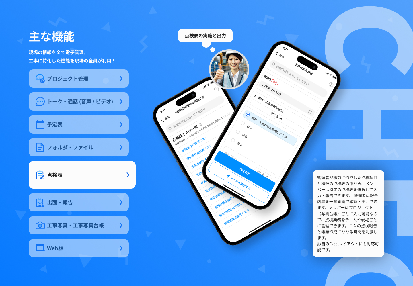 保守点検点検表アプリ現場管理アプリ 保守点検とは?意味・目的・定期点検との違いから現場管理の実務まで解説 2026年3月13日 この記事をシェアする 保守点検は事故防止や法令遵守、資産価値の維持を支える重要な管理業務です。しかし、「何をどこまで行えばよいのか」と悩んでいる方も多いのではないでしょうか。 そこでこの記事では、保守点検の意味や目的、定期点検との違い、現場での実務ポイントまでをわかりやすく整理します。 保守点検の目的と役割とは?(読み方:ほしゅてんけん) 保守点検とは、製造現場や建設現場、インフラ設備などにおいて、機器や設備が正常に稼働するよう日常的または定期的にチェック・清掃・調整を行い、故障を未然に防ぐメンテナンス業務です。異常を早期発見することで設備停止や事故を防ぎ、安全な作業環境と品質の安定を維持することが目的です。 以下に、現場で行う主な保守点検のイメージを整理しました。 外観・動作の確認(異音・振動・発熱・ひび割れなど) 清掃や簡易メンテナンス(ほこり除去・給油など) 消耗部品の状態確認・交換 接続部や固定部の緩み・腐食の確認 設定値や計測値の確認・調整 点検結果の記録と報告 厚生労働省の「労働災害統計」の資料によると、建設業では依然として事故・死亡災害が発生しており(令和6年は77件)、日常的な保守点検の徹底が求められています。 なぜ現場で保守点検が必須なのか 保守点検が現場で必須とされるのは、使用している機材や設備の不具合を早期に発見して事故や作業停止を防ぐためです。 たとえば、重機や工具は日々の使用で劣化します。小さな異常の見逃しが事故や工期遅延につながるため、日常的な保守点検が不可欠です。 保守点検の主な対象一覧【工事現場で使用する機材・設備別】 工事現場における保守点検の対象は、日々使用している機材や仮設設備が中心です。主な対象は次のとおりです。 重機(バックホウ・クレーンなど)の作動状況や油漏れの確認 電動工具・手工具の損傷や絶縁状態の確認 仮設足場・支保工の緩みや変形の確認 仮設電気設備・分電盤の配線や漏電の確認 揚重設備・ワイヤー・フックの摩耗や破断の有無 発電機・コンプレッサーなど機械設備の異音・振動確認 もしこれらの機材や設備に不具合が生じると、作業停止や事故につながるおそれがあるため、日常点検と定期点検を組み合わせながら、安全な作業環境を維持することが重要です。 保守点検・定期点検・法定点検の違い 保守点検・定期点検・法定点検は似た言葉ですが、目的や根拠が異なります。工事現場で混同されやすい3つの違いを整理しました。 区分 目的 実施頻度 根拠 主な対象 保守点検 故障・事故の予防 日常的・随時 現場管理上の必要性 重機・工具・仮設設備など 定期点検 状態確認と劣化把握 月次・年次など 社内基準・メーカー基準 機械設備・電気設備など 法定点検 法令遵守 法律で定められた周期 消防法・労安法など 消防設備・昇降設備など 保守点検と定期点検の違い 保守点検は、日々使用している機材や設備の異常を早期に発見し、故障や事故を未然に防ぐために行う点検です。作業前後の確認や簡易的なチェックも含まれ、現場で随時実施されます。 一方、定期点検は月次・年次など一定の周期を決めて計画的に実施し、劣化状況や性能を体系的に確認する点検です。目的は共通しますが、実施頻度と計画性に違いがあります。 保守点検と法定点検の違い 保守点検は、現場管理の一環として機材や設備の安全性を維持するために行う予防的な点検です。これに対し法定点検は、消防法や労働安全衛生法、建設業法などの法令にもとづき、対象設備や実施周期が明確に定められた義務的な点検を指します。以下に例をまとめました。 荷役運搬機械と建設機械:1年を超えない期間ごとに1回 足場・支保工:組立後および作業開始前ごとの点検 法定点検は報告義務が伴う場合もあり、未実施や虚偽報告は行政指導や罰則の対象となる可能性があります。 保守点検の種類と実施タイミング 保守点検は、実施のタイミングや目的によって種類に分かれます。以下より、3種類の保守点検の概要と実施タイミングを紹介します。 日常点検(簡易・目視中心) 日常点検は、作業前後や使用前に行う簡易的な点検です。主に目視や動作確認によって異常の有無を確認します(以下参照)。 重機の油漏れや異音の確認 足場や仮設設備の緩み・変形の確認 工具の破損や絶縁状態の確認 短時間で実施できる点検ですが、小さな異常を早期に発見するうえで重要な役割を担います。 定期点検(計画点検) 定期点検は、月次・年次など一定の周期を決めて計画的に行う点検です。日常点検よりも詳細に確認し、部品交換や整備を実施します(以下参照)。 車両系建設機械の月例点検 クレーンの年次点検 発電機やコンプレッサーの性能確認 劣化の進行状況を把握し、計画的な修繕につなげることが目的です。 臨時点検・緊急点検 臨時点検